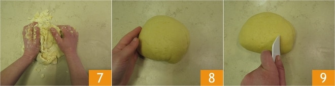 Travaillez très bien la pâte pour bien amalgamer les ingrédients, puis transférez-la sur un plan de travail et pétrissez encore jusqu'à obtenir un mélange homogène 8. La consistance de la pâte ne sera pas dure, elle sera assez molle, mais non collante. Prélevez 90 g de pâte 9, en gardant le reste couvert pour ne pas le laisser sécher.