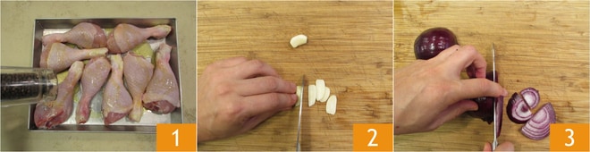 Pour préparer les cuisses de poulet à la méditerranéenne, assaisonnez dans un bol les cuisses de poulet avec de l'huile, du sel et du poivre 1. Mettez de côté et occupez-vous du soffritto. Coupez l'ail en tranches 2 et l'oignon en fines lamelles 3.