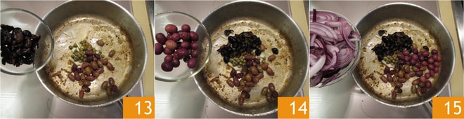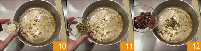 Dans la même poêle où vous avez cuit le poulet, ajoutez l'ail 10, les câpres 11, les olives de Gaeta 12.
