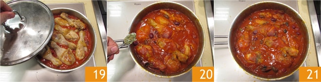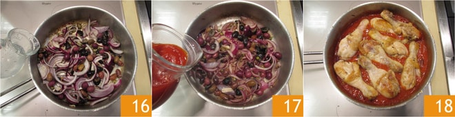 Faites revenir deux minutes et déglacez le fond avec de l'eau 16. Versez le coulis de tomate 17, ajoutez les cuisses mises de côté 18.