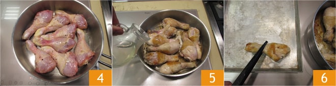 Cuisez le poulet à la poêle pendant 6 minutes de chaque côté 4, il doit avoir une belle croûte. Déglacez avec du vin blanc 5 et, lorsque l'alcool s'est évaporé, retirez les cuisses de poulet bien dorées de la poêle, laissez-les reposer dans un plat 6 ou une assiette.