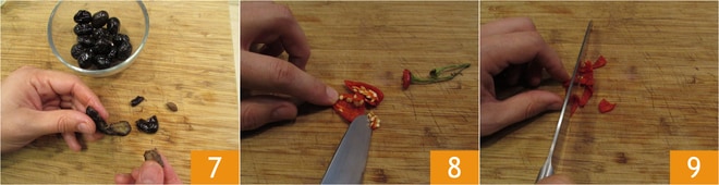 Dénoyautez la plupart des olives qui ont un noyau 7, incisez le piment et extrayez les graines internes 8, puis tranchez-le finement 9.