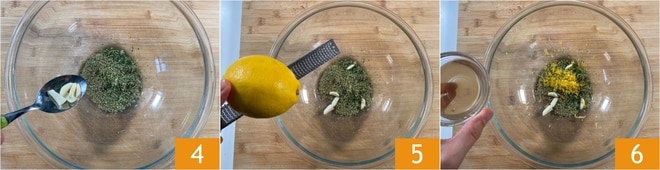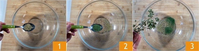 Pour préparer les cuisses de poulet à la poêle, commencez par mélanger dans un grand bol le romarin 1, le persil 2 et l'origan séché 3.