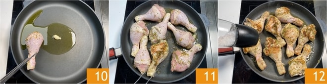 Vous êtes prêts à cuire : dans une poêle antiadhésive, chauffez l'huile avec une gousse d'ail, puis déposez les cuisses de poulet 10 et faites-les dorer à feu doux de tous les côtés 11. Une fois bien dorées, salez 12.