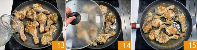 Déglacez avec le vin blanc 13 et laissez-le s'évaporer complètement, puis ajoutez l'eau, couvrez avec le couvercle 14 et faites cuire pendant 30 minutes, toujours à feu doux. Après ce temps, retirez le couvercle et poursuivez la cuisson pendant encore 10 minutes 15. Vos cuisses de poulet à la poêle sont prêtes à être servies !
