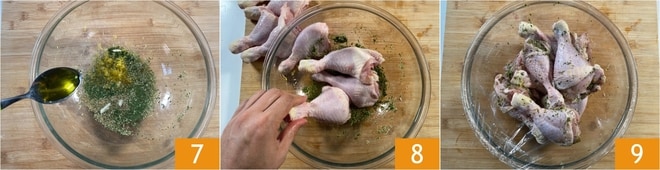 Enfin, versez l'huile 7 et placez les cuisses de poulet dans le bol 8. Massez bien la viande pour l'assaisonner uniformément, puis couvrez avec du film plastique 9. Placez le bol au réfrigérateur pendant au moins 3 heures, en retournant les cuisses à mi-temps de la marinade.
