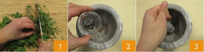 Pour réaliser les cuisses de poulet au four avec pommes, commencez par hacher finement les herbes aromatiques, c'est-à-dire le persil, la sauge, le romarin et le thym 1, et réservez. Placez dans un mortier les grains de poivre noir, blanc et rose et les baies de genièvre 2 et écrasez-les avec le pilon 3