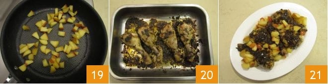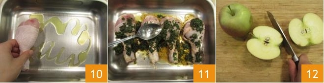 Prenez un plat allant au four et huilez le fond avec l'huile d'olive, disposez-y vos cuisses de poulet les unes à côté des autres 10, puis recouvrez-les avec le mélange épicé préparé précédemment 11. Faites cuire les cuisses dans un four statique préchauffé à 180° pendant 45 minutes. Pendant ce temps, lavez et séchez les pommes, coupez-les d'abord en deux 12