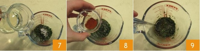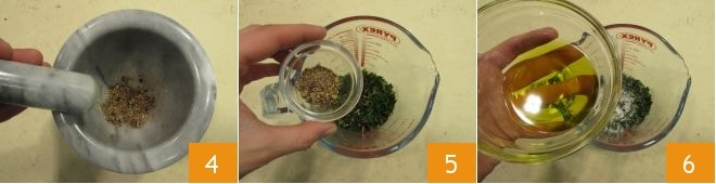 pour les réduire en poudre 4. Dans une cruche, placez le mélange d'herbes et les épices moulues 5, versez l'huile d'olive 6