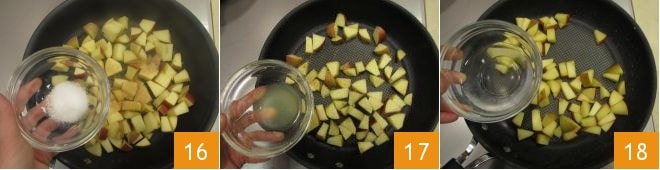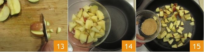 puis en quartiers et enfin réduisez-les en morceaux plus petits et irréguliers 13. Versez les morceaux de pomme dans une poêle 14, ajoutez le sucre de canne 15,