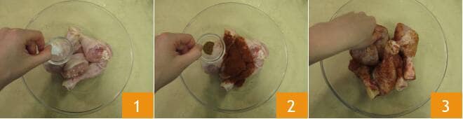 Pour préparer le poulet au paprika, commencez par assaisonner les cuisses avec du sel 1, du paprika doux et piquant 2. Mélangez bien avec les mains pour répartir les arômes 3.
