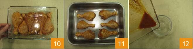 Couvrez avec un film plastique et laissez mariner au réfrigérateur pendant au moins 30 minutes 10. Après le temps nécessaire, retirez les cuisses et disposez-les sur une plaque de cuisson 11, pour plus de commodité, vous pouvez verser la marinade dans un petit bol 12.