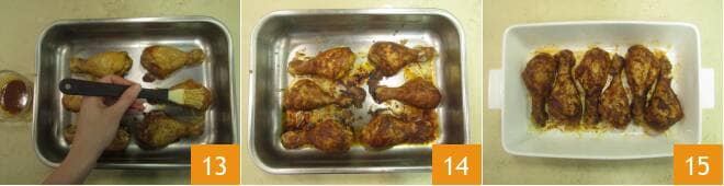 Badigeonnez la surface des cuisses avec la marinade 13 et faites cuire dans un four statique, déjà préchauffé à 200°, pendant environ 45 minutes. Toutes les 10 minutes, vous devrez badigeonner la surface des cuisses et les retourner à mi-cuisson 14. Une fois prêt, votre poulet au paprika peut être consommé bien chaud 15 !