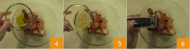 Versez l'huile 4, le vin blanc 5 et aromatisez au goût avec du poivre 6.