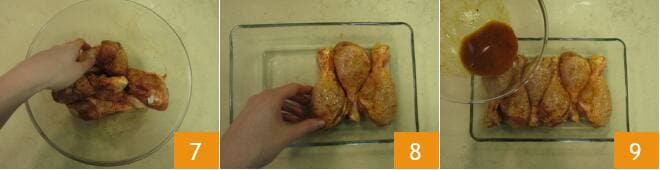 Continuez à masser les cuisses, en veillant à ce qu'elles s'imprègnent bien de manière uniforme 7. Dès que les ingrédients sont bien mélangés, transférez les cuisses assaisonnées dans un plat à four où elles peuvent être côte à côte 8 et versez la marinade par-dessus 9.
