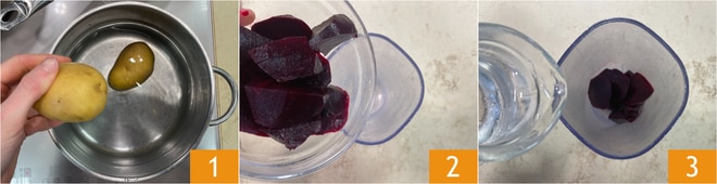 Pour préparer les culurgiones de betterave avec pommes de terre et sauce au fromage bleu, commencez par faire cuire les pommes de terre à l'eau froide ; cela prendra environ 30-40 minutes, selon la taille 1. En attendant, préparez la pâte : épluchez les betteraves cuites et mettez-les dans un récipient 2 avec l'eau 3.