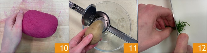 Lorsque vous aurez obtenu une pâte lisse, élastique et homogène 10, enveloppez-la dans un film plastique et placez-la au réfrigérateur pour reposer au moins 30 minutes. Entre-temps, les pommes de terre seront cuites, écrasez-les dans un bol 11. Coupez les feuilles de menthe en fines lanières 12.
