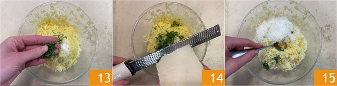 Ajoutez la menthe aux pommes de terre écrasées 13 avec une pincée de sel et le pecorino râpé 14. Mélangez bien pour amalgamer le tout 15 et réservez.