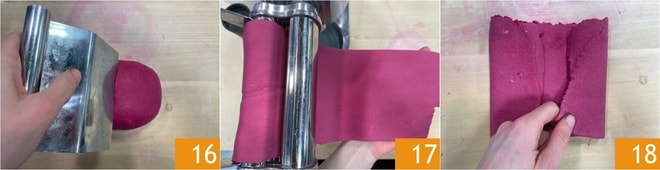 Reprenez la pâte et divisez-la en deux 16, en veillant à envelopper dans le film plastique la portion que vous n'utilisez pas pour éviter qu'elle ne sèche. Aplatissez légèrement la pâte avec les mains et commencez à l'étendre avec la machine à pâtes en partant de l'épaisseur la plus grande 17. Pliez la pâte vers le centre 18 et passez-la plusieurs fois en réduisant progressivement l'épaisseur.