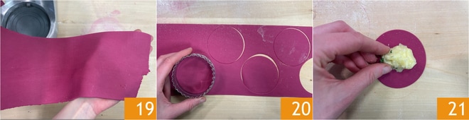 Quand vous aurez obtenu une pâte de 2 mm d'épaisseur 19, découpez des disques avec un emporte-pièce de 10 cm de diamètre 20. Vous pouvez réutiliser les chutes de pâte et les étaler à nouveau après un court repos. Placez une boule de farce au centre de chaque disque 21.