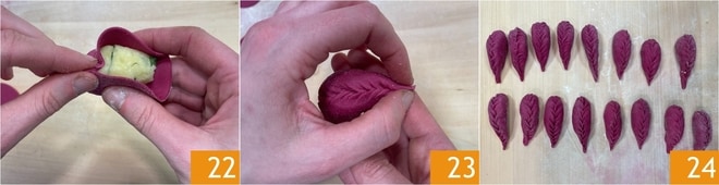 Pliez le disque en deux et pincez les bords en partant d'une extrémité 22 jusqu'à l'autre, en scellant la garniture à l'intérieur 23 ; il est normal qu'un peu de garniture sorte à la fin. Au fur et à mesure que vous formez les culurgiones, déposez-les sur le plan de travail légèrement saupoudré de semoule 24 et réservez-les un moment.