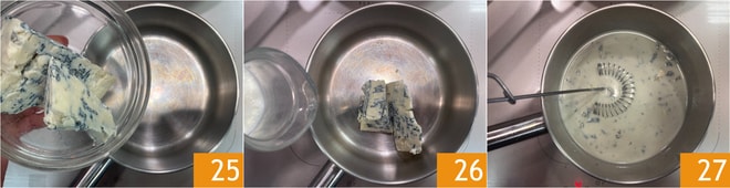 Enfin, préparez la fondue : dans une petite casserole, mettez le roquefort 25 et le lait 26, puis allumez le feu à très basse température et mélangez avec un fouet jusqu'à ce que le fromage soit complètement fondu 27.