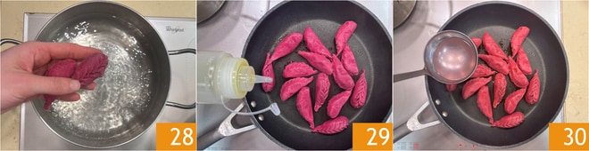 Vous êtes prêts pour la cuisson : portez à ébullition une casserole d'eau salée, plongez délicatement les culurgiones 28 et faites cuire pendant 3-4 minutes. Lorsqu'ils remontent à la surface, égouttez-les et transférez-les dans une poêle antiadhésive, puis ajoutez un filet d'huile 29 et une louche d'eau de cuisson 30. Faites sauter brièvement le tout pour mélanger, puis vous êtes prêts à dresser.