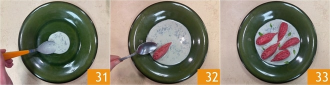 Répartissez la sauce de roquefort à la base de l'assiette 31, puis déposez les culurgiones 32 et garnissez de feuilles de menthe. Vos culurgiones de betterave avec pommes de terre et sauce au fromage bleu sont prêts 33 !