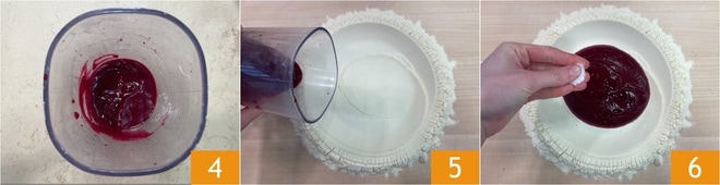 Mixez avec un mixeur plongeant pour obtenir une purée lisse et homogène 4. Disposez la semoule en fontaine sur le plan de travail, puis versez la purée de betterave au centre 5 et ajoutez une pincée de sel 6.