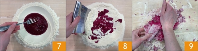 Commencez à incorporer la farine en mélangeant avec une fourchette 7, puis continuez avec une spatule 8 et enfin travaillez la pâte avec les mains 9.