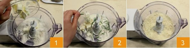 Pour préparer le cœur de gîte en croûte avec lard et cèpes, commencez par la Pâte brisée. Mettez la farine tamisée et le beurre en morceaux froid du réfrigérateur dans un robot équipé de lames 1. Nettoyez le romarin et ajoutez les petites feuilles 2. Actionnez les lames et mixez le tout jusqu'à obtenir un mélange sablonneux et farineux 3.