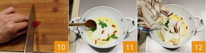 Ensuite, préparez le soffritto: incisez le piment, retirez la queue et les graines internes, puis coupez-le en fines tranches 10; épluchez la gousse d'ail, divisez-la en deux et retirez le germe. Dans une poêle antiadhésive, faites revenir l'huile, l'ail et le piment avec quelques feuilles de persil 11. Ajoutez les champignons 12, salez et poivrez à votre goût, puis laissez cuire à feu vif pendant 10 minutes.
