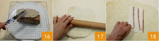 Lorsque le gîte a pris couleur, éteignez le feu et placez-le sur une grille avec une assiette en dessous pour recueillir l'excès d'huile. Avec un couteau, étalez délicatement la crème de champignons sur le gîte de manière homogène sur tous les côtés 16, à l'exception de celui du dessous; n'oubliez pas de conserver une partie de la crème de champignons cèpes car elle vous servira de garniture supplémentaire. Une fois le temps écoulé, sortez la pâte brisée du réfrigérateur, placez-la sur un plan de travail légèrement fariné et étalez-la avec un rouleau à pâtisserie 17 en une feuille de 1 à 2 mm d'épaisseur et de dimensions nécessaires pour couvrir le gîte. Vous pouvez alors procéder à la composition du gîte en croûte: commencez par disposer les tranches de lard au centre de la feuille, côte à côte verticalement, pour couvrir la longueur du gîte 18;