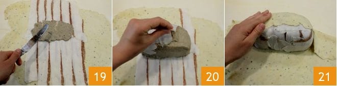 puis superposez d'autres tranches pour bien couvrir tout le périmètre qui enveloppera la viande, puis étalez la crème de cèpes restante sur la partie centrale. Placez-y la viande 19 et commencez à l'envelopper avec les tranches de lard, en les repliant délicatement jusqu'à bien couvrir toute la surface 20. Avec vos mains, enveloppez délicatement la feuille de pâte brisée autour du gîte, en essayant de la faire adhérer le plus possible 21.