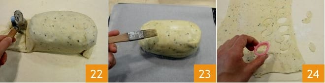 Avec une roulette ou un couteau, coupez les bords de pâte en excès, que vous conserverez pour les décorations finales 22, enfin rabattez bien les parties latérales. Placez le gîte sur une plaque recouverte de papier sulfurisé et badigeonnez le rouleau avec un œuf battu pour que les décorations adhèrent bien 23. Préparez ensuite les décorations, en étalant la pâte brisée restante avec un rouleau et en découpant des petites feuilles avec un emporte-pièce 24;