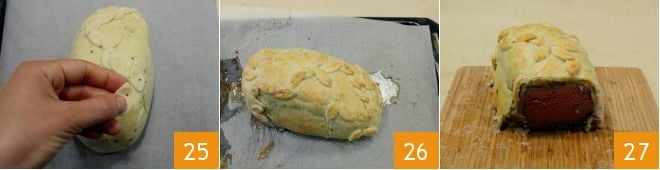 Complétez en disposant toutes les feuilles sur la surface de la croûte 25 et badigeonnez-les avec l'œuf. Faites cuire dans un four statique préchauffé à 180° pendant 30 minutes (ou dans un four ventilé à 160° pendant 20 minutes). Une fois prêt et bien doré 26, servez le gîte en croûte avec lard et cèpes bien chaud 27.
