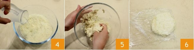 Mettez le mélange dans un bol, assaisonnez de sel et de poivre. Ajoutez l'eau glacée en filet 4 et pétrissez rapidement tous les ingrédients à la main pour obtenir une pâte compacte et lisse 5; formez ensuite une boule, aplatissez-la légèrement et laissez-la reposer pendant au moins 30 minutes au réfrigérateur, enveloppée dans du film plastique 6.