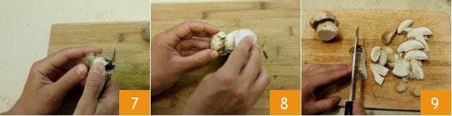 Entre-temps, procédez à la Comment nettoyer les cèpes: avec un couteau affûté à lame lisse, commencez par éliminer la partie terreuse sur le pied, en le grattant délicatement jusqu'à éliminer toute trace de terre 7. Si les champignons sont assez propres, éliminez les quelques résidus de terre avec un pinceau ou avec un chiffon humide en coton 8 (s'ils sont encore très sales, passez-les rapidement sous un jet d'eau froide courante). Une fois le nettoyage terminé, coupez les champignons entiers dans le sens de la longueur et mettez-les de côté 9.