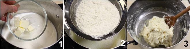 Pour préparer la pâte des petits cœurs, versez le lait dans une casserole, ajoutez le beurre et le sel 1 et portez à frémissement; retirez la casserole du feu et ajoutez immédiatement la farine, d'un seul coup 2. À l'aide d'une cuillère en bois, mélangez vigoureusement jusqu'à amalgamer les ingrédients 3 et obtenir un mélange assez compact (s'il vous semble grumeleux, ne vous inquiétez pas).