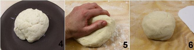 Laissez tiédir la pâte obtenue 4, puis transférez-la sur un plan de travail légèrement fariné et pétrissez-la à la main 5 jusqu'à obtenir une pâte lisse et homogène 6.