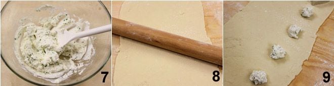 Étalez la pâte des petits cœurs à l'aide d'un rouleau à pâtisserie 8 pour former une feuille rectangulaire d'une épaisseur maximale de 1-2 mm : avec une cuillère à café, prenez un peu de garniture et déposez-la en petits tas sur la feuille 9, à environ 10 cm de distance les uns des autres.