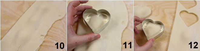Couvrez les petits tas avec la pâte (en la refermant en livre) 10 et avec l'emporte-pièce en forme de cœur découpez les formes. (11-12) Procédez de cette manière, en pétrissant à chaque fois les chutes jusqu'à épuisement des ingrédients. Une fois que vous avez toutes les formes, prenez deux assiettes : dans l'une vous mettrez la chapelure et dans l'autre l'œuf battu.