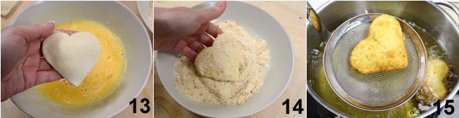 Trempez chaque petit cœur d'abord dans l'œuf battu 13, puis passez-le dans la chapelure 14 et faites-le frire dans de l'huile modérément chaude (non bouillante) jusqu'à ce que les deux côtés soient dorés 15. Égouttez les petits cœurs, déposez-les sur du papier absorbant de cuisine et servez-les immédiatement.