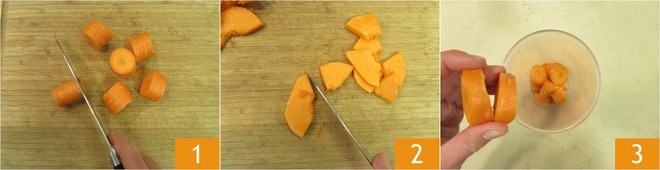 Pour réaliser les cupcakes à la citrouille et aux carottes, commencez par laver et éplucher les carottes, puis coupez-les en morceaux grossiers 1. Épluchez la citrouille, retirez les graines internes et coupez-la en petits morceaux 2. Placez les morceaux de légumes dans un grand verre 3.