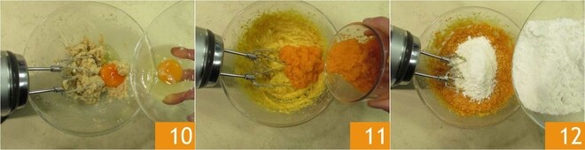 Commencez à fouetter avec un batteur électrique en incorporant les œufs 10, un par un, la purée de légumes 11 et la farine 12.