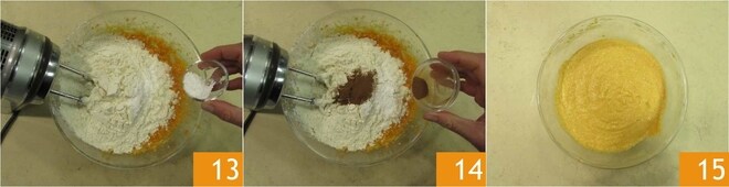 Ajoutez également la levure 13 et la cannelle en poudre 14. Continuez à mélanger avec les fouets jusqu'à obtenir un mélange homogène 15.