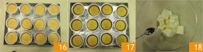 Versez la pâte dans 12 moules en papier insérés dans autant de moules en aluminium 16 d'une capacité d'environ 120 ml. Faites cuire les cupcakes dans un four statique préchauffé à 180° pendant 40 minutes. Après la cuisson, sortez les gâteaux et laissez-les refroidir 17. Occupez-vous du glaçage : dans un bol, versez le beurre mou, l'extrait de vanille 18.
