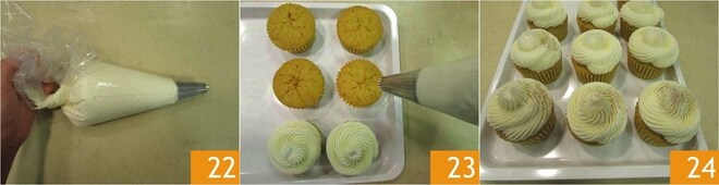 Transférez la crème dans une poche à douille avec une douille dentelée de 15 mm 22. Récupérez les cupcakes, garnissez-les sur le dessus avec la crème au beurre 23 et la cannelle en poudre. Les cupcakes à la citrouille et aux carottes sont prêts à être dégustés 24.
