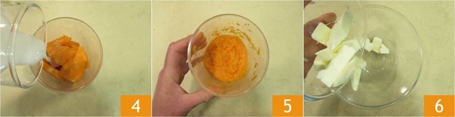 Versez la crème 4 et mixez avec un mixeur plongeant pour obtenir une purée 5. Placez le beurre en morceaux mou dans un bol 6