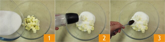 Pour préparer les cupcakes de Noël, versez le beurre ramolli dans un bol, ajoutez le sucre 1, une pincée de sel 2 et l'extrait de vanille 3.